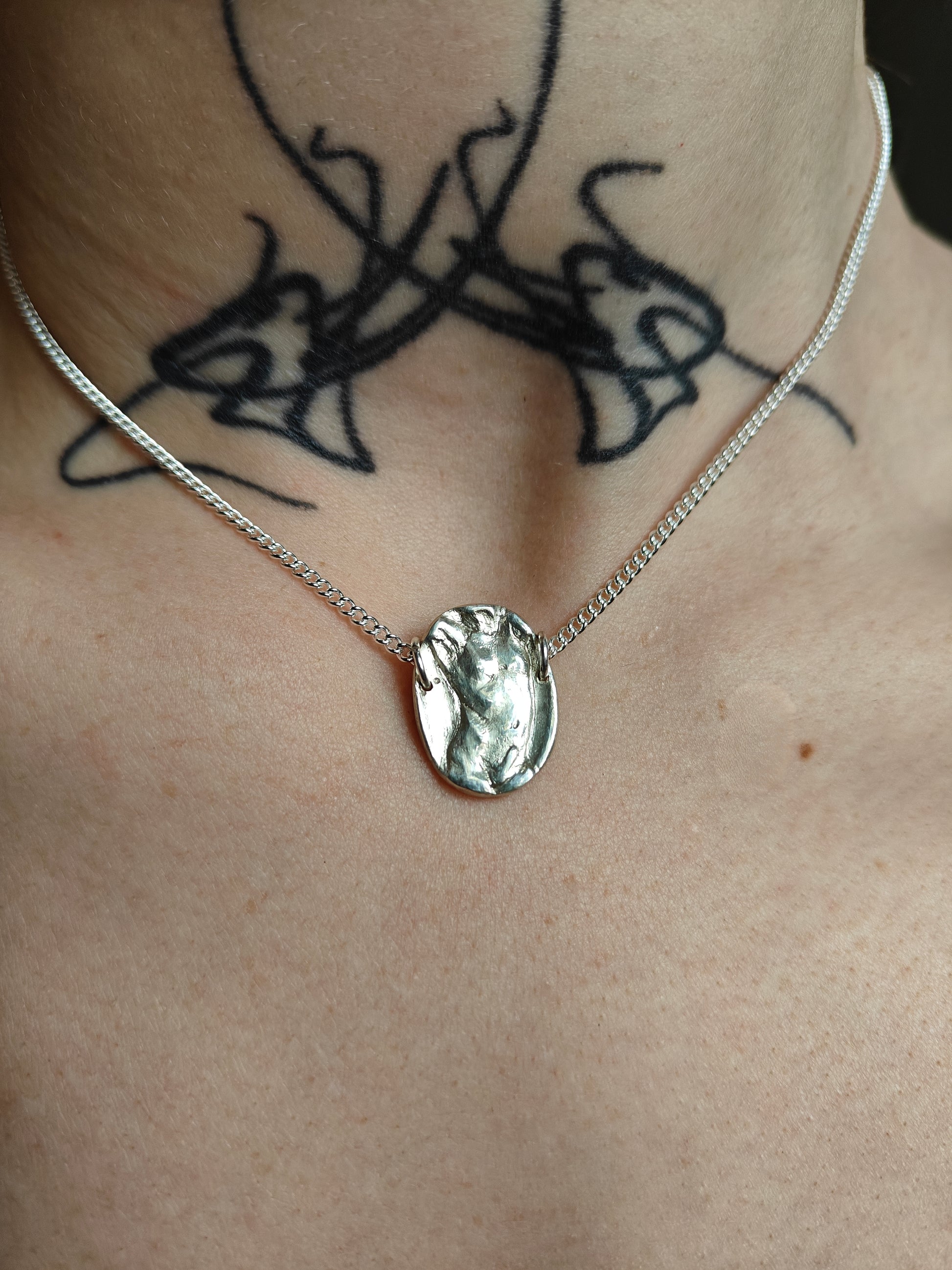 Sculpted by hand in silver clay, it carries traces of the artist’s hand, balancing intimacy and strength.