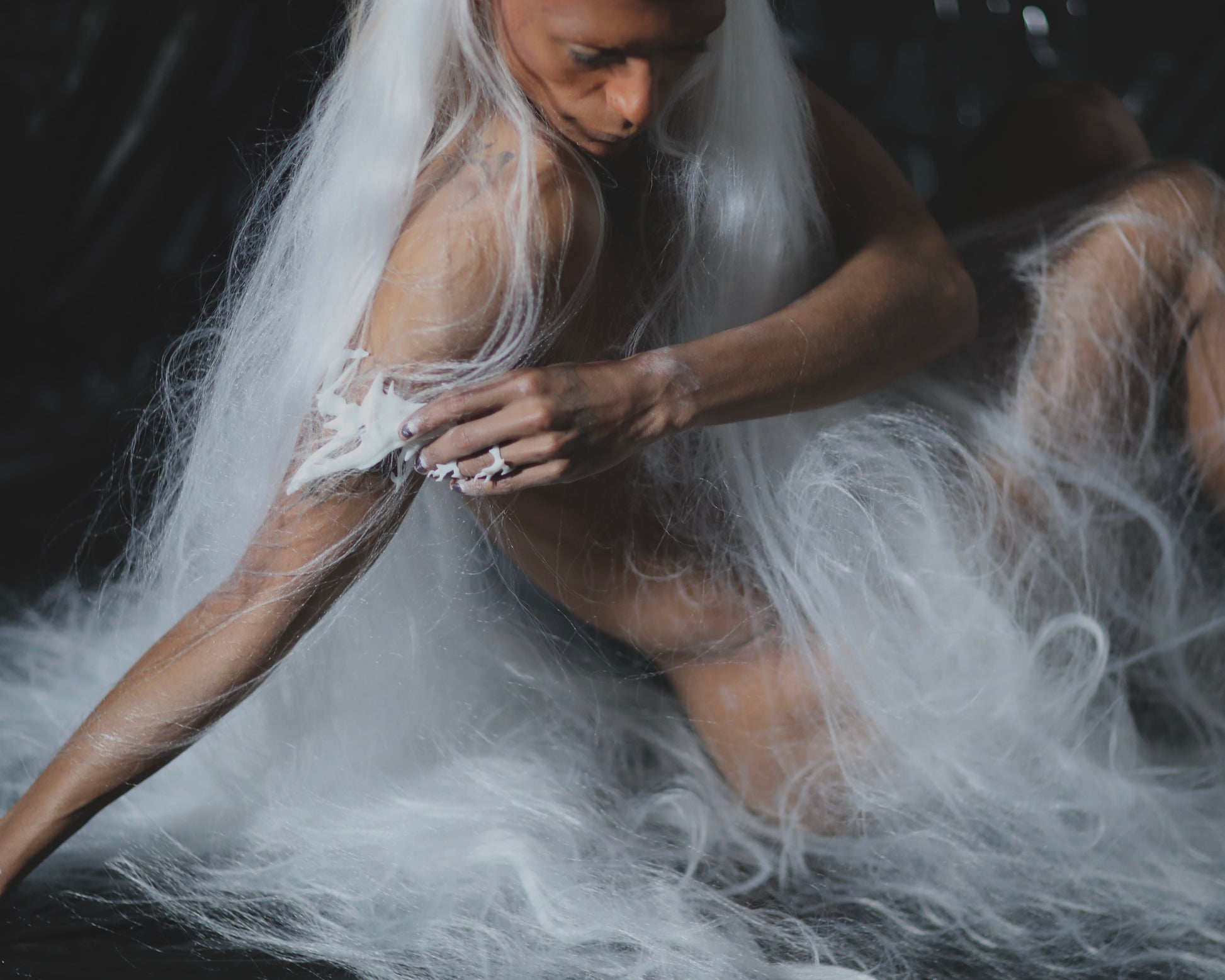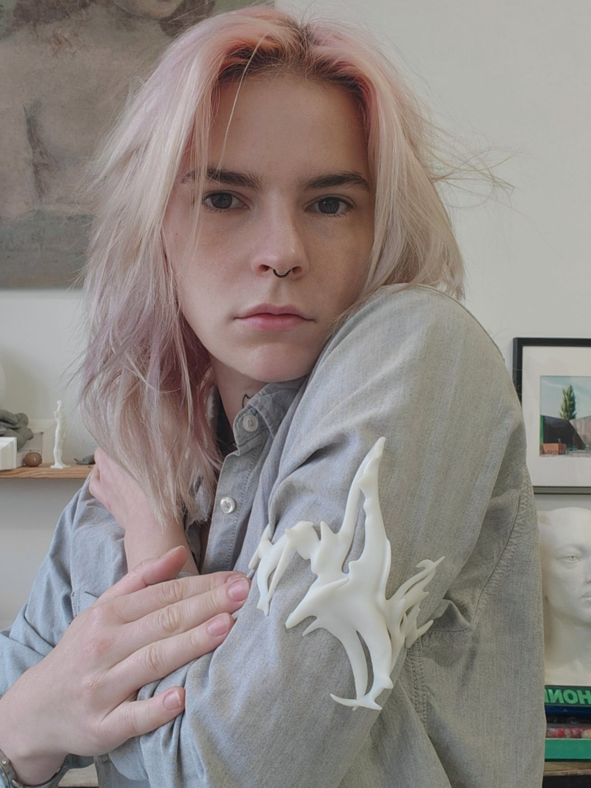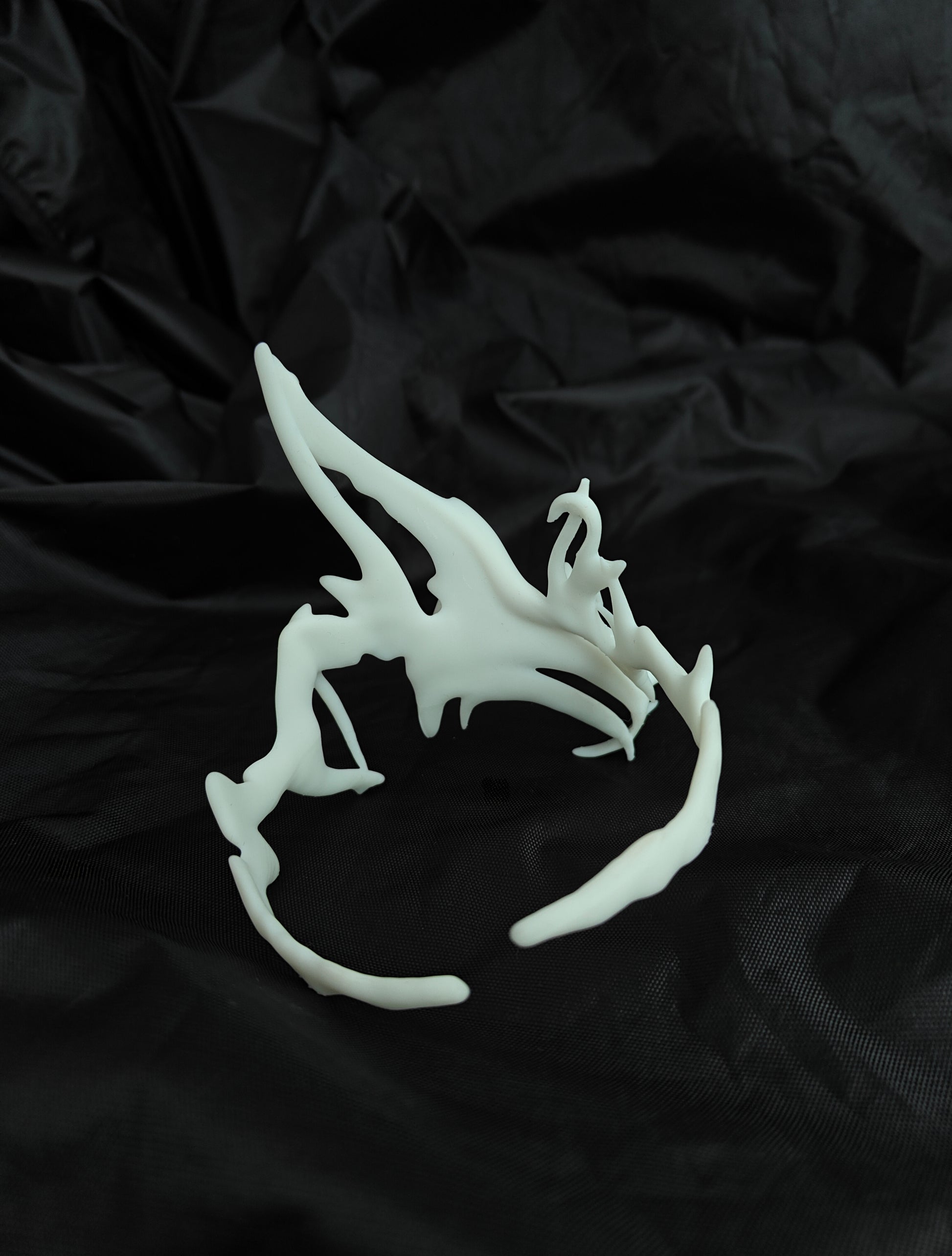 A statement armband, digitally sculpted and 3D printed in white soy-based resin. Its flowing organic form evokes corals, fossils, bones, or natural structures.