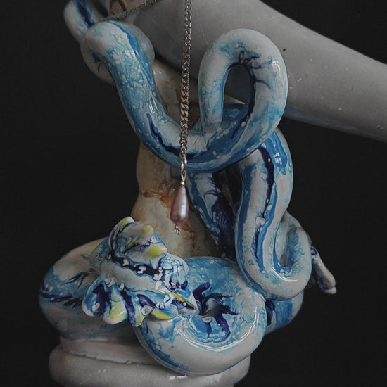 A hand-sculpted ceramic drinking horn inspired by ancient cornucopias and Renaissance European silver horns. The horn is detachable and secured with silicone stoppers and a silver chain finished with a pink freshwater pearl, preventing it from slipping during use.