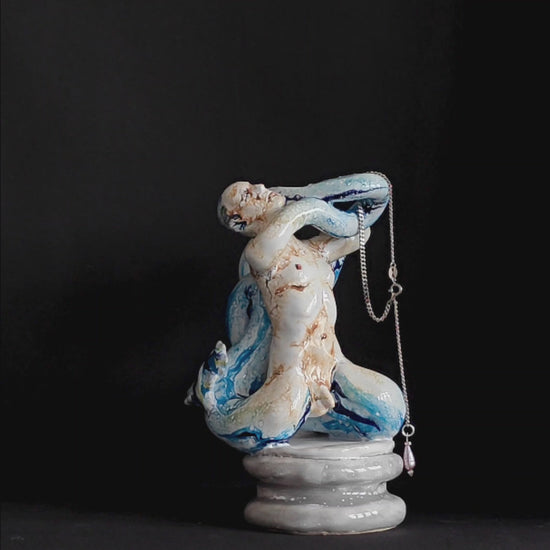 The sculptural support depicts a hermaphroditic Triton — a mythical sea being from the ancient world, with sea snakes forming its limbs. The horn itself is adorned with 10K gold details, including a crescent moon and a winged fascinum — an ancient protective symbol associated with vitality, fertility, and power.