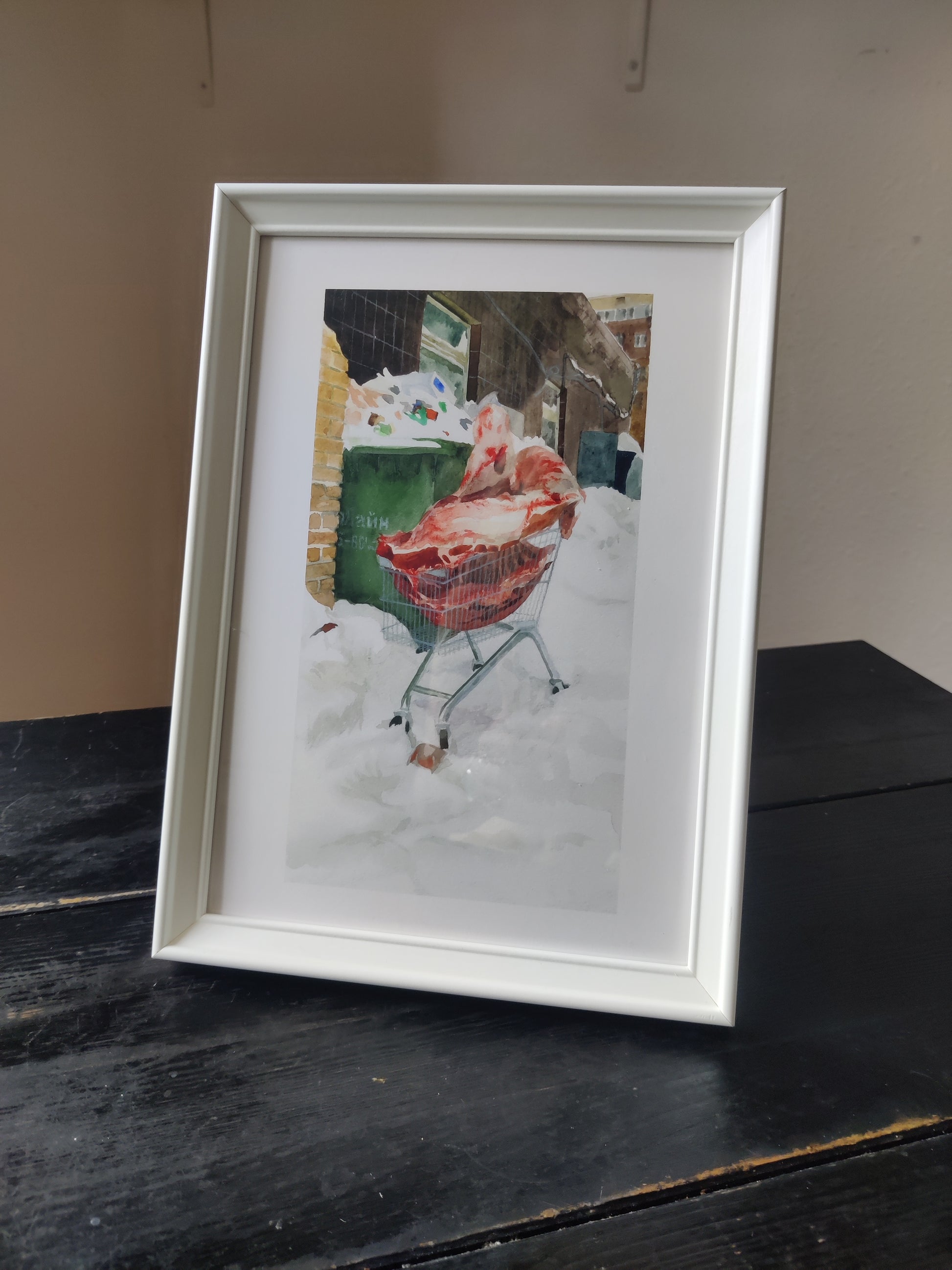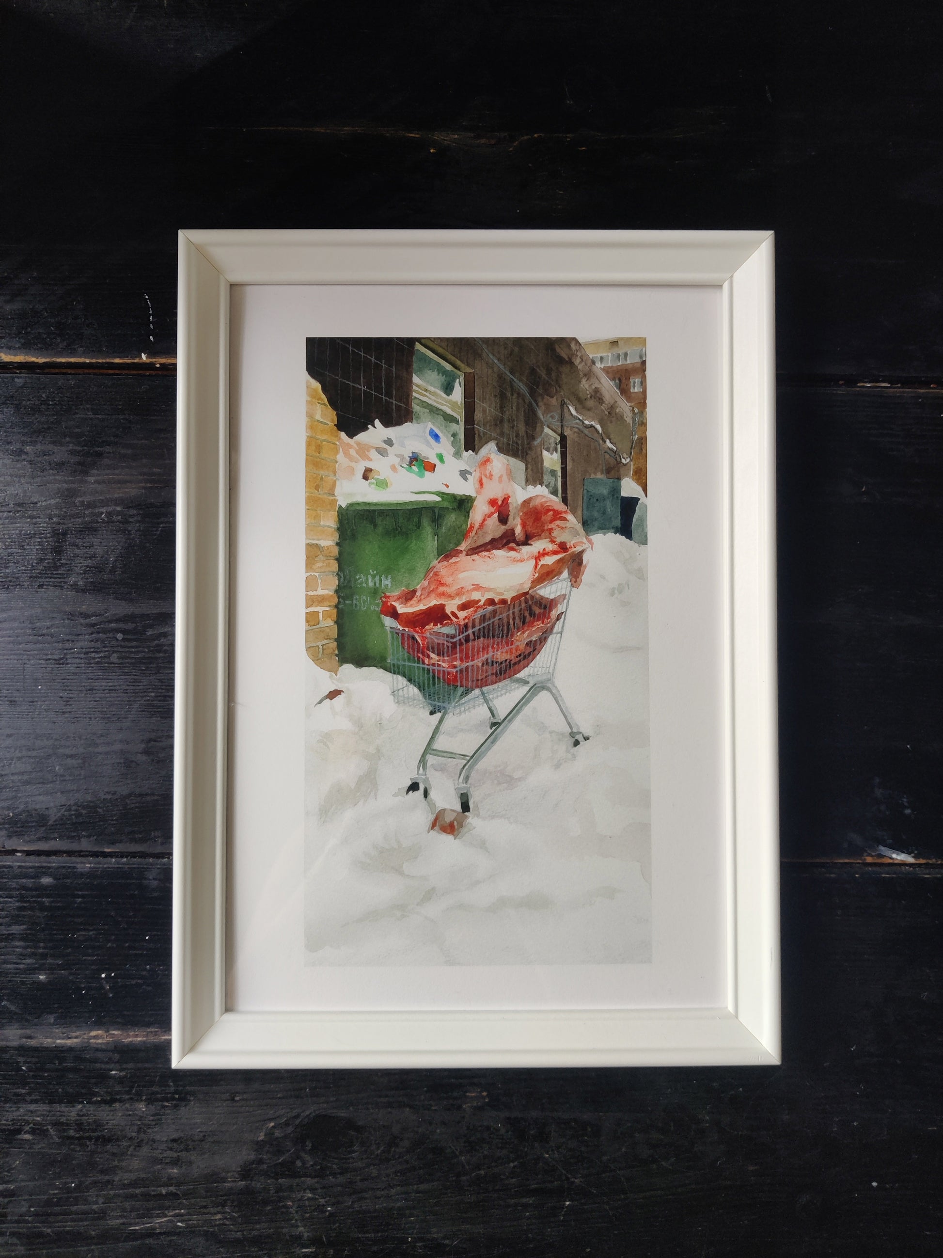 One of my most treasured watercolors to date—an absurd and brutal street scene. This high-quality watercolor drawing print depicts a meat delivery in Moscow.