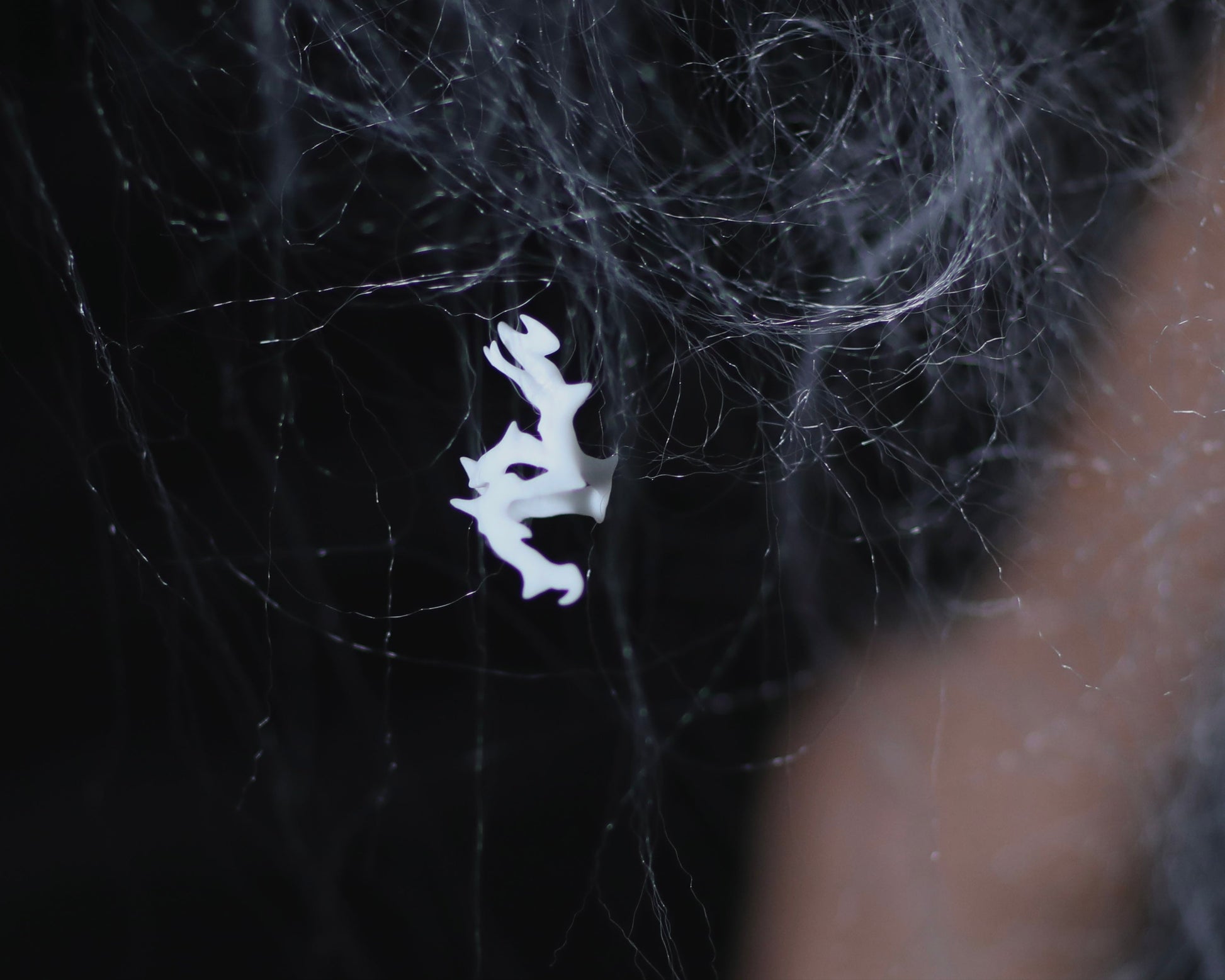 These rings are for those who feel fragile, but dangerous. The shape is digitally sculpted and 3D-printed in the artist’s studio. The alluring white material has a subtle translucency, reminiscent of bone or polished marble.