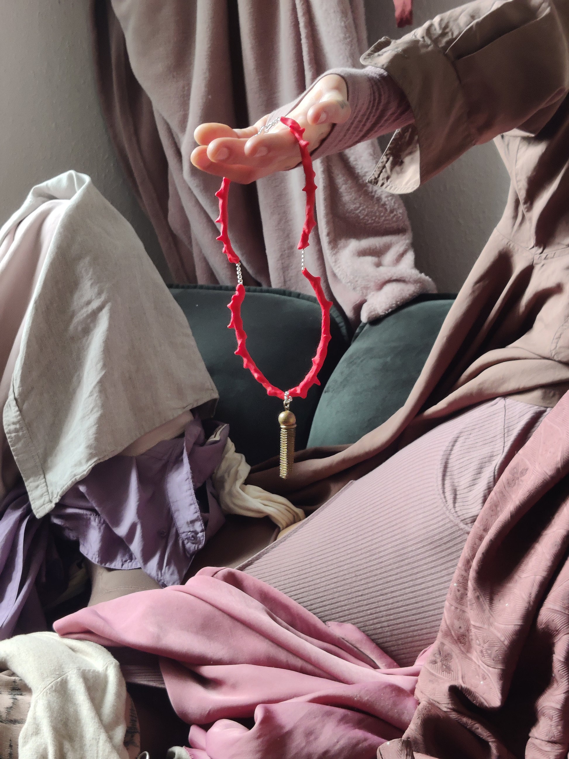 The red necklace can be worn either at its full length (55 cm) or as a choker (42 cm). It is adorned with a vintage glass medal (1950s–60s) and an authentic glass eye prosthetic.