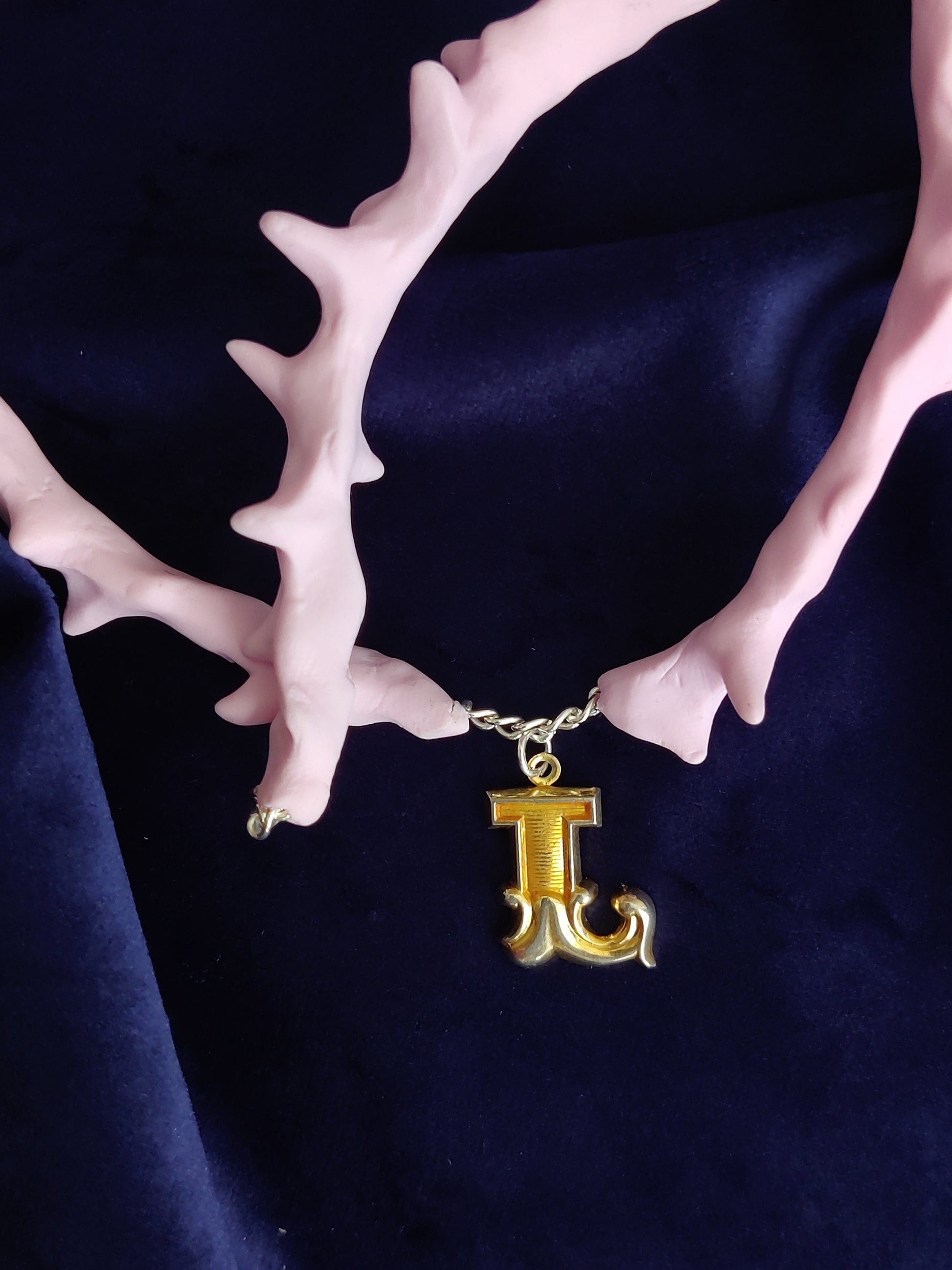 The pink necklace can be worn either at its full length (47 cm) or as a choker (37 cm). It is adorned with a vintage metal "L" pendant.