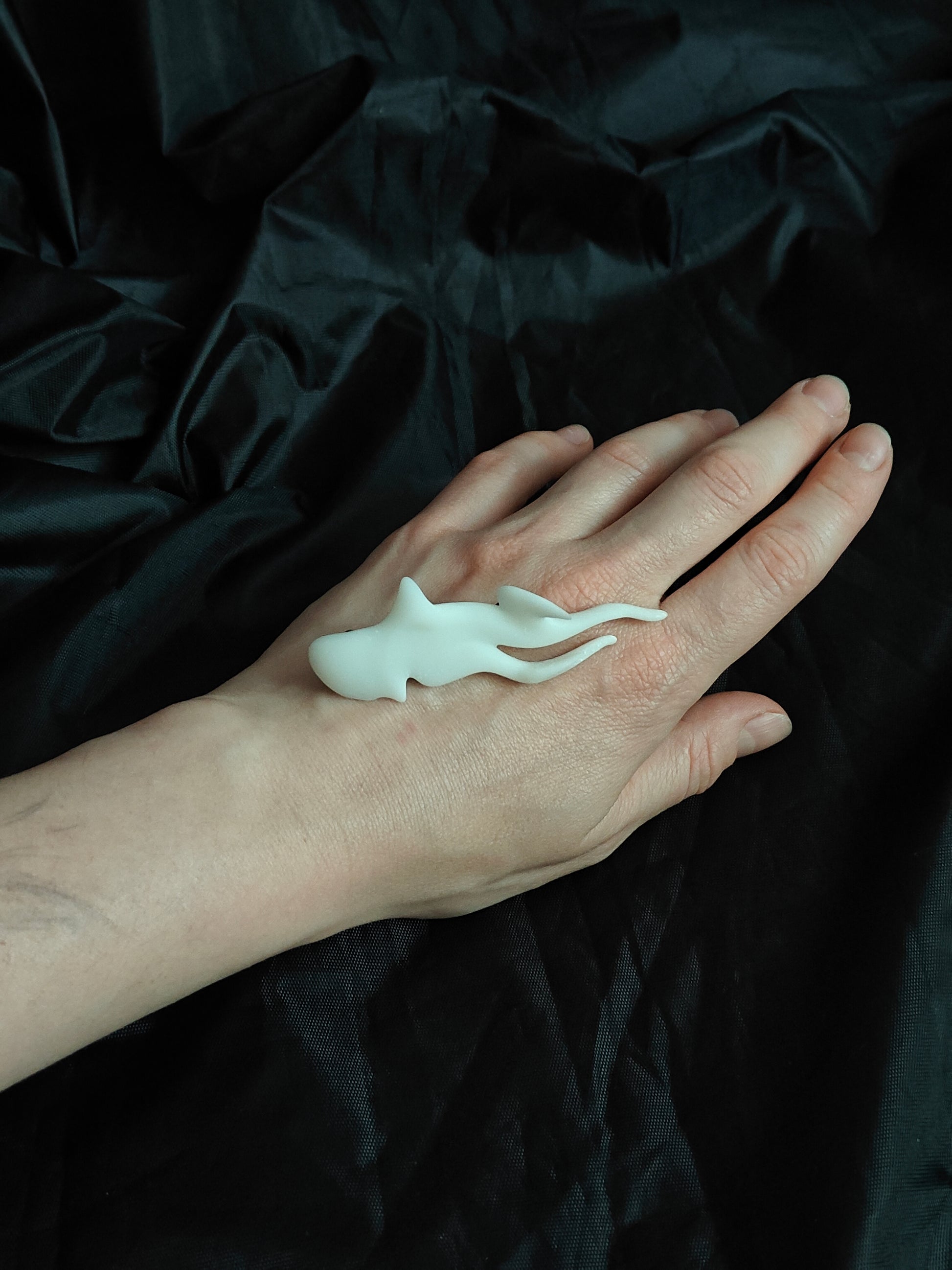Lightweight yet durable, “Thorn Of A Fin” is a wearable sculpture – an ode to natural forms, digitally reimagined. The alluring white material has a subtle translucency, reminiscent of bone or polished marble.