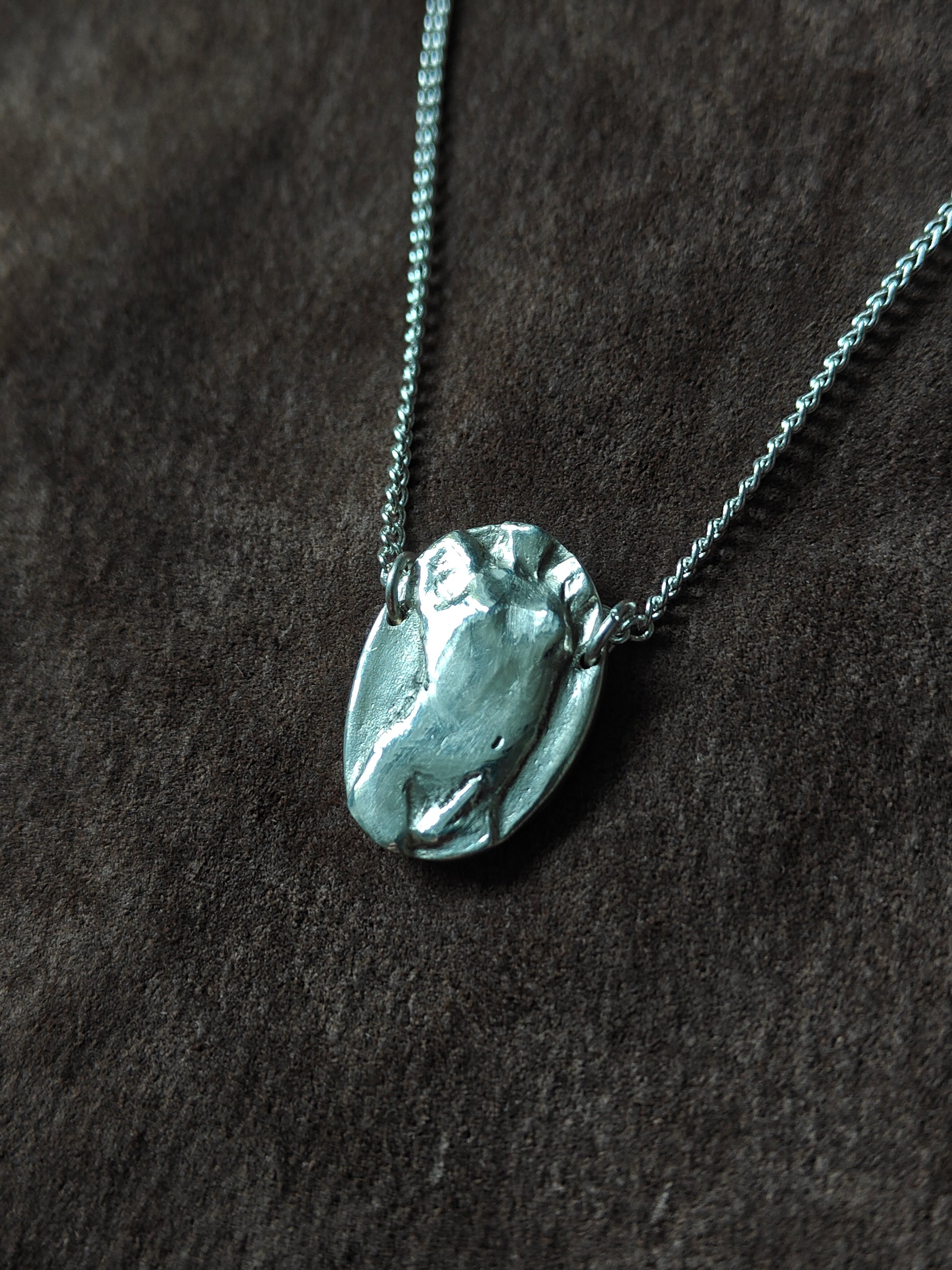 Sculpted by hand in silver clay, it carries traces of the artist’s hand, balancing intimacy and strength.